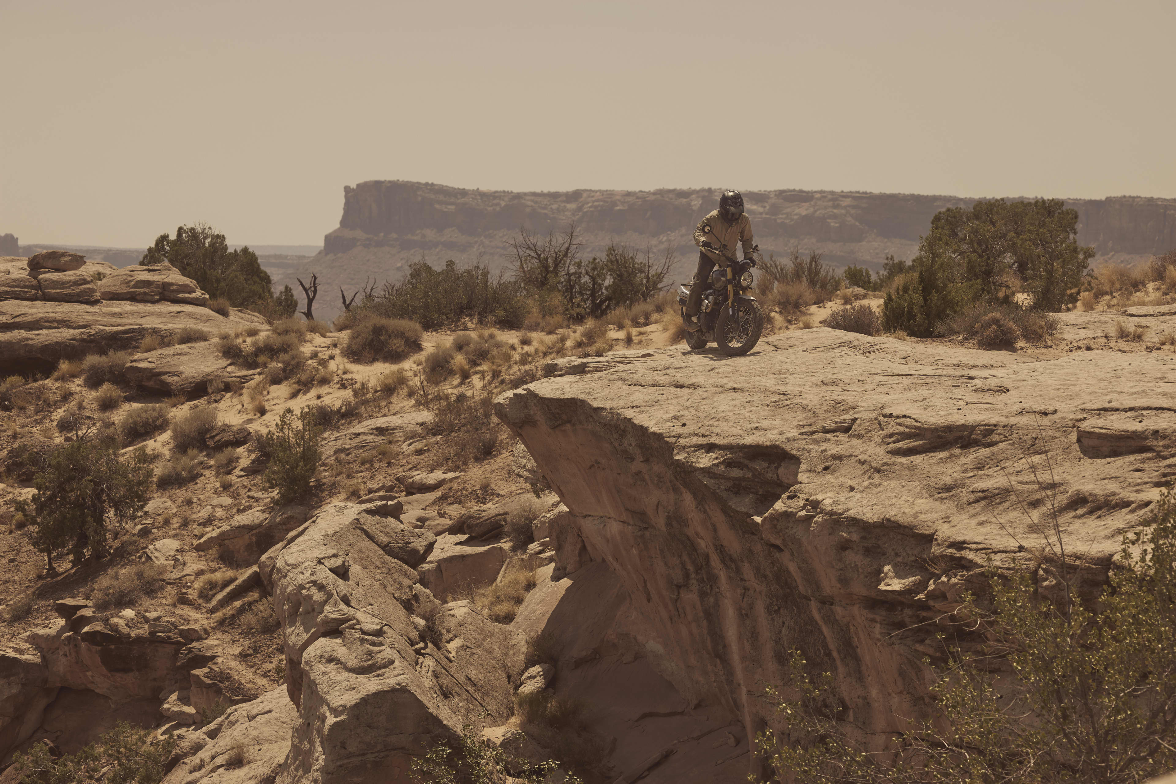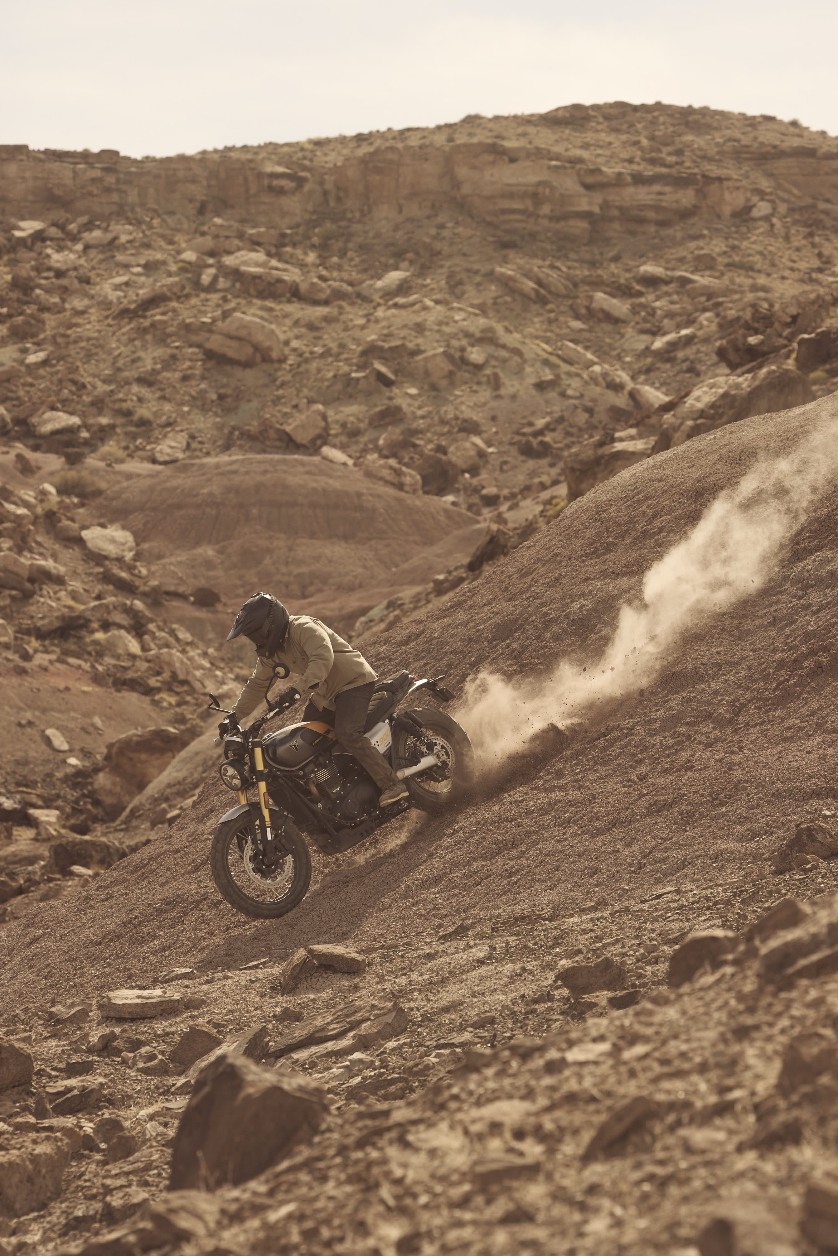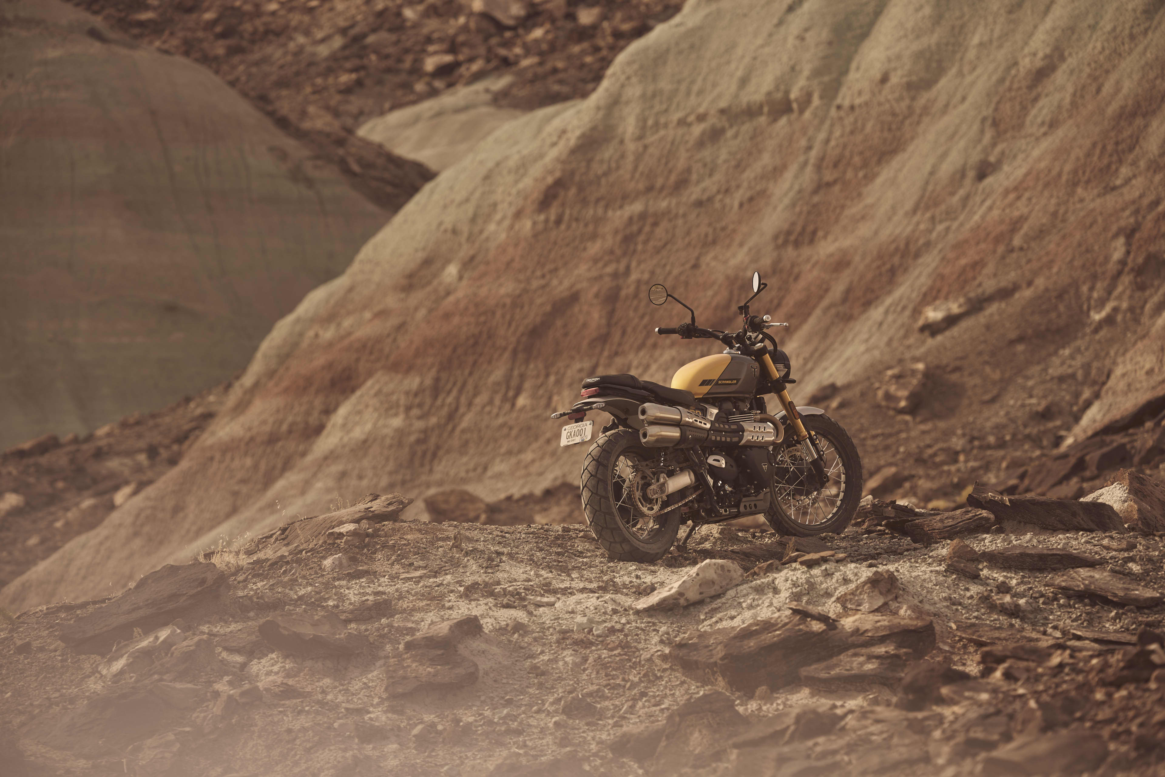 Minimalistický dizajn, široké riadidlá a charakteristický dvojitý tlmič výfuku vo vyššej pozícii, ochranný kryt olejovej vane a pevné špicové kolesá s pneumatikami s dvojitým účelom dotvárajú robustný štýl Scrambler.